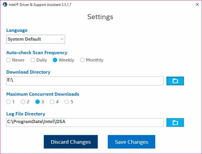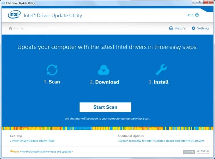 النافذة الرئيسية جذابة للغاية وسهلة التعرّف على آلية عمل البرنامج. في البداية، انقر على زر "فحص" للحصول على معلومات حول برامج تشغيل بطاقات الرسومات من Intel، والشبكات اللاسلكية، واللوحة الأم، ووحدات Intel NUC، ووحدات Intel Compute Stick. بعد الفحص، تعرض الأداة قائمة ببرامج التشغيل مع معلومات مفصلة تُمكّنك من تحديد الإصدارات المناسبة لنظامك. يمكنك تغيير وتيرة الفحص من أداة "التشغيل مرة واحدة" للحصول على أسرع تحديثات لبرامج التشغيل.